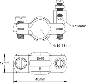 Erdungs-Rohrschelle, zur Sicherstellung des Potentialausgleichs nach DIN VDE 0100..., verwendbar für Rohrleitungen aus Kupfer. Abmessungen (ca. Maße) B x T : 48 x 20 mm für Rohr-Ø