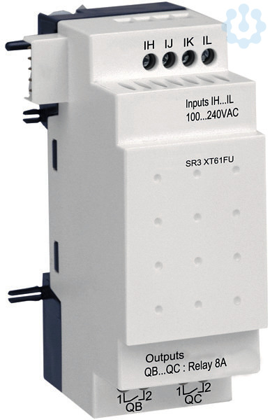 Kleinsteuerung in Kompaktausführung. Digitale E/A-Erweiterungsmodule. Erweiterungsmodul, 6 E/A, 100-240V AC. Ausgang_R 2, Eingang_Bin 4. Die Spannungsversorgung der Erweiterungsmodule E/A und Kommunikation erfolgt über die Kleinsteuerung.