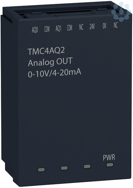 Cartridge M241, 2 analoge Ausgänge (16-Bit-Auflösung), konfigurierbar als Spannung 0-10 V oder Strom 0-20 mA/4-20 mA. Anschluss über eine Schraubklemmenleiste.