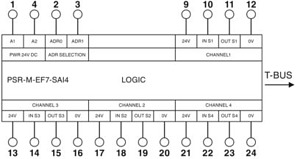 Sicheres Erweiterungsmodul mit 4 sicheren Analogeingängen, 0 V ... 10 V, 0 mA oder 4 mA ... 20 mA, TBUS-Schnittstelle, bis SILCL 3, Kat. 4/PL e, SIL 3, steckbare Schraubklemme, TBUS-Verbinder liegt bei