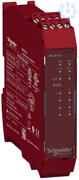 Preventa. Erweiterungsmodul für den modularen Sicherheitscontroller XPSMCM. Eingänge 8, digital, sicher. Ausgänge 0. Taktausgänge 4 für Querschlusserkennung. LED-Anzeige für jeden Eingang. Rückwandstecker beiliegend. Anschluss steckbare Schraubklemmen.
