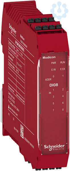 Preventa. Erweiterungsmodul für den modularen Sicherheitscontroller XPSMCM. Eingänge 8, digital, sicher. Ausgänge 0. Taktausgänge 4 für Querschlusserkennung. LED-Anzeige für jeden Eingang. Rückwandstecker beiliegend. Anschluss steckbare Federzugklemmen.