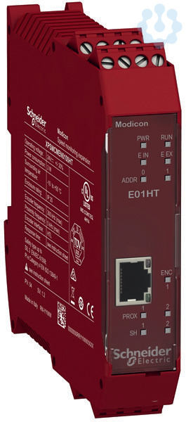 Preventa. Erweiterungsmodul für den modularen Sicherheitscontroller XPSMCM zur sicheren Drehzahl- und Drehrichtungsauswertung. Eingänge 1 Encoder HTL über RJ45-Buchse, 2 Sensoren über Klemmen. Rückwandstecker beiliegend. Anschluss steckbare Schraubklemmen.