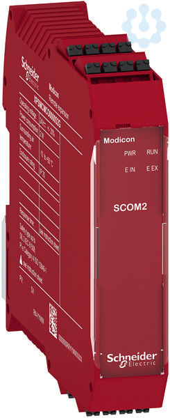 Preventa. Erweiterungsmodul für sichere Kommunikation des modularen Sicherheitscontrollers XPSMCM. Realisierung von dezentralen Konzepten. Leitungslänge 50 m bis zum nächsten Modul. Gesamtleitungslänge 250 m. Topologie Linie. dieses Modul befindet sich innerhalb der Linie und kommuniziert mit 2 weiteren Modulen. Anschluss steckbare Federzugklemmen.