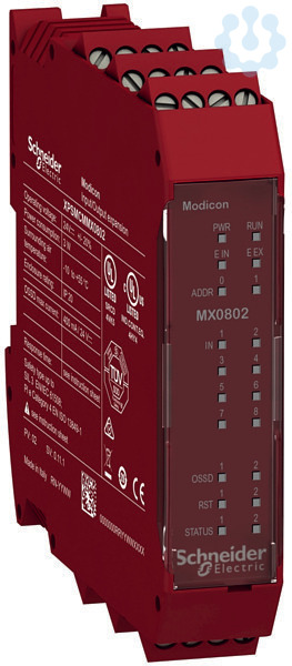 Preventa. Erweiterungsmodul für den modularen Sicherheitscontroller XPSMCM. Eingänge 8, digital, sicher. Ausgänge 2, digital, sichere OSSD-Ausgangspaare. Taktausgänge 4 für Querschlusserkennung, 2 für EDM und Start. Diagnoseausgänge 2, Transistoren. LED-Anzeige für jeden Ein- und Ausgang. Rückwandstecker beiliegend. Anschluss steckbare Schraubklemmen.