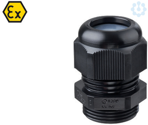 Ex-Kabelverschraubung aus Polymid PA6, Staubschutzscheibe: Polyethylen PE-LD, Farbe: weiß, großer Dicht- und Klemmbereich, Schutzart: IP66 Farbe: tiefschwarz (RAL 9005)