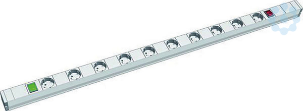 FACTORY, Profil ALU, 1 HE VM 10xSchutzkontaktsteckdosen, 1xSchalter grün links, 1xSchalter rot rechts, 1xStromeingang GST18 links seitlich im Profil, 2xStromausgang GST18 rechts seitlich im Profil, im Polybeutel verpackt.