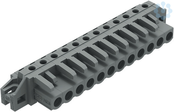 THT-Federleiste. Lötstift 0,6 x 1,0 mm. abgewinkelt. Befestigungflansch. 2,5 mm². Rastermaß 5 mm. 12-polig. grau