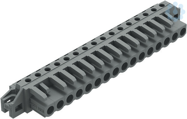 THT-Federleiste. Lötstift 0,6 x 1,0 mm. abgewinkelt. Befestigungflansch. 2,5 mm². Rastermaß 5 mm. 16-polig. grau