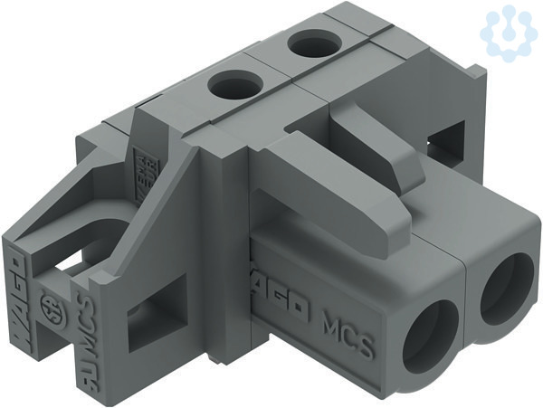 THT-Federleiste. Lötstift 0,6 x 1,0 mm. abgewinkelt. Befestigungflansch. 2,5 mm². Rastermaß 5 mm. 2-polig. grau