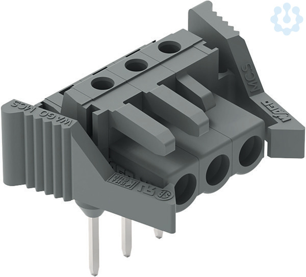 Federleiste für Reihenklemmen. Stifte 0,6 x 1 mm. abgewinkelt. Verriegelungsklinke. Rastermaß 5 mm. 3-polig. grau