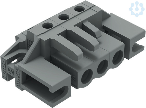 THT-Federleiste. Lötstift 0,6 x 1,0 mm. abgewinkelt. Distanzflansch. 2,5 mm². Rastermaß 5 mm. 3-polig. grau