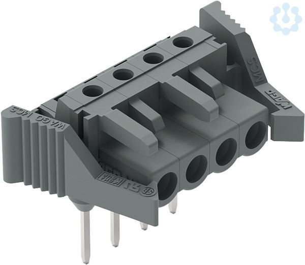 Federleiste für Reihenklemmen. Stifte 0,6 x 1 mm. abgewinkelt. Verriegelungsklinke. Rastermaß 5 mm. 4-polig. grau