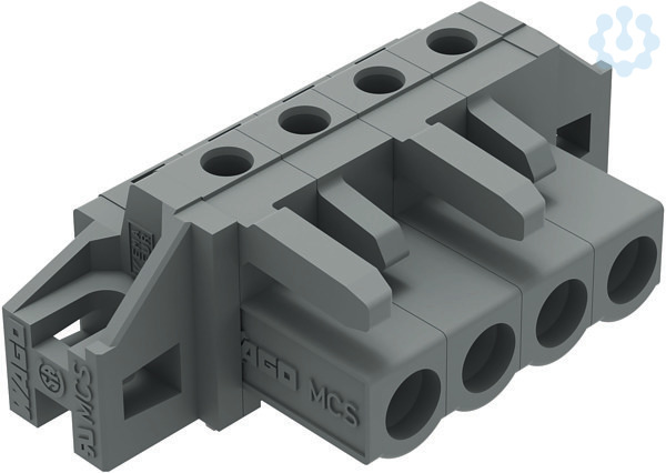 THT-Federleiste. Lötstift 0,6 x 1,0 mm. abgewinkelt. Befestigungflansch. 2,5 mm². Rastermaß 5 mm. 4-polig. grau