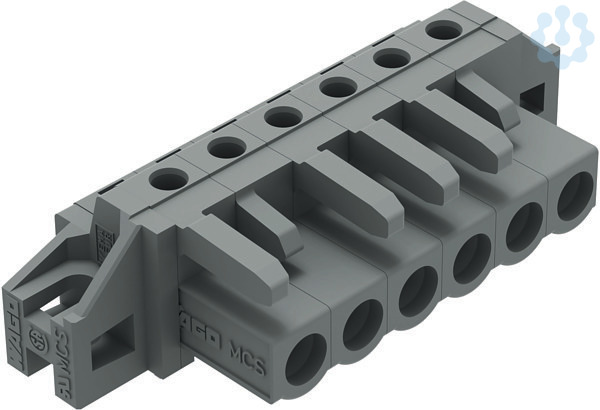 THT-Federleiste. Lötstift 0,6 x 1,0 mm. abgewinkelt. Befestigungflansch. 2,5 mm². Rastermaß 5 mm. 6-polig. grau