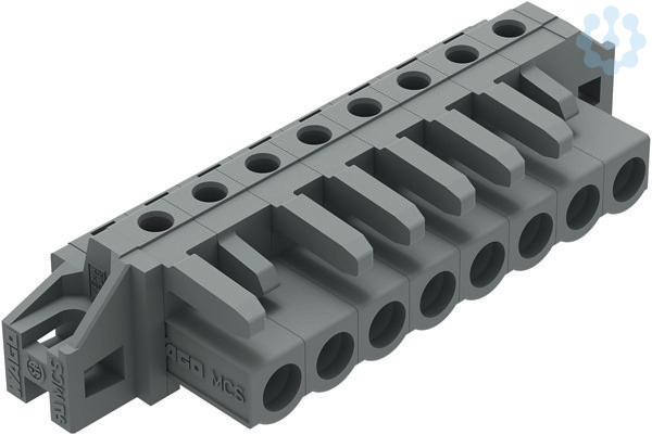 THT-Federleiste. Lötstift 0,6 x 1,0 mm. abgewinkelt. Befestigungflansch. 2,5 mm². Rastermaß 5 mm. 8-polig. grau