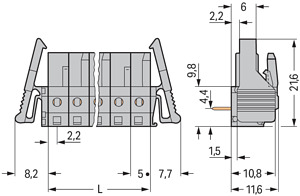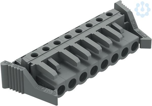 THT-Federleiste. Lötstift 0,6 x 1,0 mm. abgewinkelt. Verriegelungsklinke. 2,5 mm². Rastermaß 5 mm. 8-polig. grau