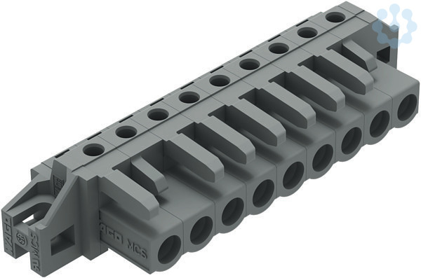 THT-Federleiste. Lötstift 0,6 x 1,0 mm. abgewinkelt. Befestigungflansch. 2,5 mm². Rastermaß 5 mm. 9-polig. grau
