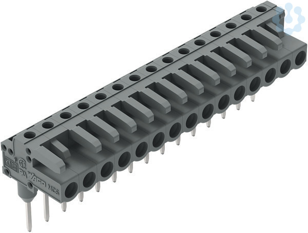 Federleiste für Reihenklemmen. Stifte 0,6 x 1 mm. abgewinkelt. Rastermaß 5 mm. 15-polig. grau