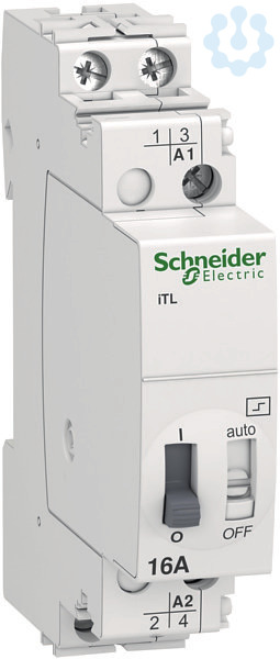 Fernschalter Acti 9 iTL. 2-polig, 2 Schließer, Nennstrom 16A, Steuerspannung (Uc) 230-240V AC / 110V DC. Fernschalter zum Schalten von Beleuchtungsstromkreisen mit einem oder mehreren Tastern. Breite in TE 1.