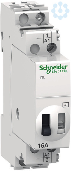 Fernschalter Acti 9 iTL. 1-polig, 1 Schließer, Nennstrom 16A, Steuerspannung (Uc) 130V AC / 48V DC. Fernschalter zum Schalten von Beleuchtungsstromkreisen mit einem oder mehreren Tastern. Breite in TE 1.