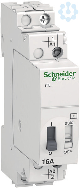 Fernschalter Acti 9 iTL. 1-polig, 1 Schließer, Nennstrom 16A, Steuerspannung (Uc) 230-240V AC / 110V DC. Fernschalter zum Schalten von Beleuchtungsstromkreisen mit einem oder mehreren Tastern. Breite in TE 1.