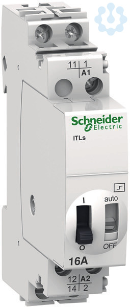 Fernschalter Acti 9 iTLs. 1-polig, 1 Schließer, Nennstrom 16A, Steuerspannung (Uc) 230-240V AC / 110V DC. Fernschalter zum Schalten von Beleuchtungsstromkreisen mit einem oder mehreren Tastern.