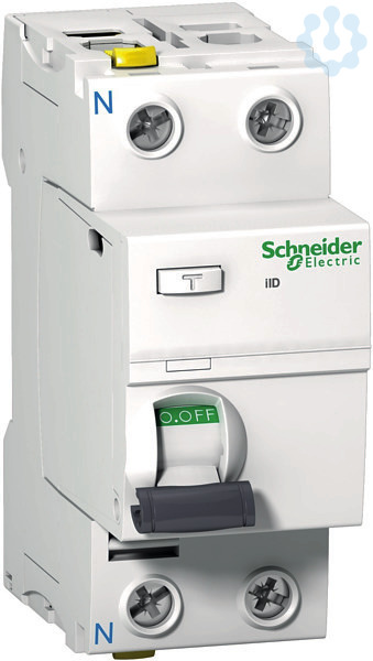 Fehlerstromschutzschalter Acti 9 iID, 1,5kA (IEC/EN 61008-1). 2-polig, Nennstrom 63A, Erdschlussempfindlichkeit 30mA, Erdschluss-Schutzklasse Typ A, Betriebsspannung (Ue) 230V AC, Isolationsspannung (Ui) 500V AC. Gewährleistet den Zusatzschutz bei direktem Berühren (? 30mA). Fehlerschutz bei indirektem Berühren, z.B. bei Isolationsfehlern (? 100mA, ? 300mA). Fehlerschutz in Baustromverteilern (500mA). Schalten und Trennen von Stromkreisen. Sprungschaltung für verschleißarmes Schalten der Kontakte. Mit mechanischer frontseitiger Fehlermeldeanzeige (VisiTrip) zur Anzeige von Auslösungen durch Überlast oder Kurzschluss. Sichere Kontaktanzeige (VisiSafe) des Fehlerstromschutzschalters, bei grüner Anzeige Sicherheit der Spannungsfreiheit auf der Abgangsseite. Prüftaste für die regelmäßige Prüfung der Funktion. Doppel-Anschlussklemmen für beidseitigen Anschluss von Kabeln oder Phasenschienen. Einfache Entnahme des Einzelgerätes bei installierter Phasenschiene, dank des frontseitig erreichbaren Befestigungselementes