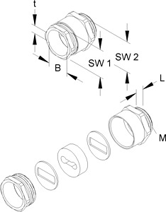 Kabelverschraubung mit metrischem Anschlussgewinde nach DIN EN 60423, mit Sechskant-Zwischenstutzen, mit Druckringe und Dichtring. Verwendbar für Flachkabel. Nenngröße