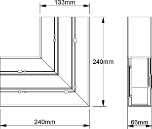 Gerätekanal-Flachwinkel 90°, einzügig, symmetrisch, mit zwei durchgehenden Aufnahmeprofilen im Rückenteil sowie durchlaufender Perforation im Kanalrücken, einschließlich zwei Kanalkupplungen KUV, Stoßstellenverbinder BSV65 zur exakten Verbindung mit dem Kanalunterteil bitte gesondert bestellen. VDE zertifiziert! Abmessungen (ca. Maße) H x T : 133 x 66 mm Deckelöffnung