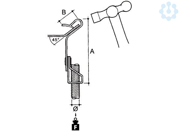 E-Klips, Flanschkralle 45° mit Winkelabhänger, zum Aufschlagen mit dem Hammer auf verschiedenste 45° abgewinkelte Trägerflansche, für Gewindestababhängung.