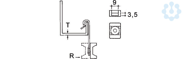 E-Klips, Flanschkralle mit Anschlussstück, zum Aufschlagen mit dem Hammer auf verschiedenste abgewinkelte Trägerflansche, mit an der Vorderseite angebrachtem Anschlussstück aus Kunststoff für die Befestigung von Kabel und Leitungen, Anschlussstück halogenfrei.