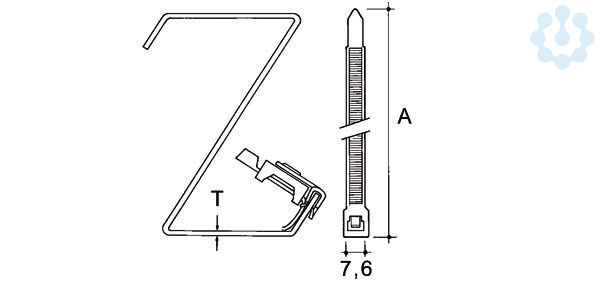 E-Klips, Flanschkralle mit Anschlussstück und Kabelbinder, zum Aufschlagen mit dem Hammer auf verschiedenste abgewinkelte Trägerflansche, mit an der Rückseite angebrachtem Anschlussstück aus Kunststoff und Kabelbinder für die Befestigung von Kabel und Leitungen, Anschlussstück und Kabelbinder halogenfrei.