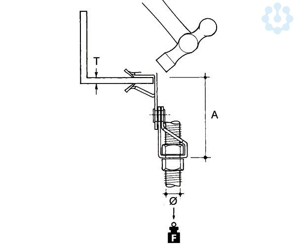 E-Klips, Flanschkralle mit Winkelabhänger, zum Aufschlagen mit dem Hammer auf verschiedenste Trägerflansche, für Gewindestababhängungen.