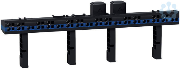 PrismaSeT P. Linergy FM Verteilerblock 2-polig mit einer zulässigen Stromstärke bis 200 A mit Einspeiseklemmen für Kabel bis 50 mm² und abgangsseitiger Anschlusskapazität für Kabel ohne Hülsen von 12 x Phase und 18 x Neutralleiter mit maximal 10 mm². mit einer Bemessungsstoßstromfestigkeit (Ipk) 25 kA, Bemessungskurzschlussstrom (Isc) 150 kA mit einspeiseseitigem Schutz von 150 kA (Icc), Bemessungsisolationsspannung (Ui) 750 V AC, Bemessungsspannung (Ue) 690 V AC. Bemessungsstoßspannungsfestigkeit (Uimp) 8 kV, mit Schutzart IPxxB zur rückseitigen Montage an einer DIN-Schiene mit einer Breite von 24 Moduleinheiten (18 mm).