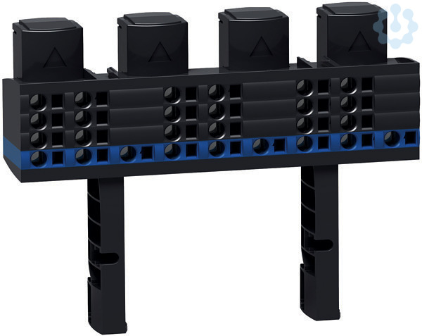 PrismaSeT P. Linergy FM Verteilerblock 4-polig mit einer zulässigen Stromstärke bis 160 A mit Einspeiseklemmen für Kabel bis 50 mm² und abgangsseitiger Anschlusskapazität für Kabel ohne Hülsen von 6 x Phase und 6 x Neutralleiter mit maximal 10 mm². mit einer Bemessungsstoßstromfestigkeit (Ipk) 27 kA, Bemessungskurzschlussstrom (Isc) 150 kA mit einspeiseseitigem Schutz von 150 kA (Icc), Bemessungsisolationsspannung (Ui) 750 V AC, Bemessungsspannung (Ue) 690 V AC. Bemessungsstoßspannungsfestigkeit (Uimp) 8 kV, mit Schutzart IPxxB zur rückseitigen Montage an einer DIN-Schiene mit einer Breite von 12 Moduleinheiten (18 mm).