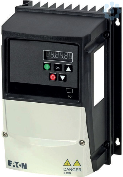Frequenzumrichter, Typkenner: DC1, Bemessungsbetriebsspannung: Ue = 400 V AC, 3-phasig, 480 V AC, 3-phasig, Ausgangsspannung bei Ue: U2 = 400 V AC, 3-phasig, 480 V AC, 3-phasig, Netzspannung (50/60Hz): ULN = 380 (-10%) - 480 (+10%) V, Bemessungsbetriebsstrom bei 150 % Überlast: Ie = 2.2 A, Hinweis: Bemessungsbetriebsstrom bei einer Schaltfrequenz von 6 kHz und einer Umgebungstemperatur von +40 °C, Hinweis: Überlastzyklus für 60 s alle 600 s, Zugeordnete Motorleistung Hinweis: für normale vierpolige, innen- und außenbelüftete Drehstrom-Asynchronmotoren mit 1500 min-1 bei 50 Hz bzw. 1800 min-1 bei 60 Hz, Überlastzyklus für 60 s alle 600 s, bei 400 V, 50 Hz, Zugeordnete Motorleistung 150 % Überlast: P = 0.75 kW, 150 % Überlast: IM = 1.9 A, Zugeordnete Motorleistung Hinweis: bei 440 - 480 V, 60 Hz, Zugeordnete Motorleistung 150 % Überlast: P = 1 HP, Zugeordnete Motorleistung 150 % Überlast: IM = 2.1 A, Schutzart: IP66/NEMA 4X, Schnittstelle/Feldbus (eingebaut): OP-Bus (RS485)/Modbus RTU, CANopen®, Feldbusanschalt