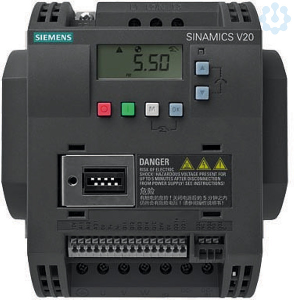 SINAMICS V20 380-480 V 3 AC -15/+10% 47-63Hz Bemessungsleistung 4 kW mit 150% Überlast für 60 s integrierter Filter C3 E/A: 4 DI, 2 Digitalausgänge, 2 Analogeingänge, 1 AO Feldbus: USS / MODBUS RTU mit integriertem BOP-Schutz: IP20/ UL ungekapselt Baugröße: B 140x160x165 (BxHxT) mit integrierter Bremseinheit