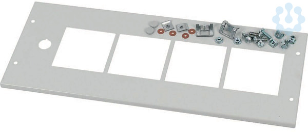 Frontplatte vorbereitet zum Einbau von 4 Stk Messgeräte (96/96), +1 Ausstanzung 22,5mm für RMQ Titan, Modulbreite 600mm, Modulhöhe 200mm, Materialstärke 1mm Stahlblech beschichtet RAL7035, incl. Scharniere und Schraubmaterial