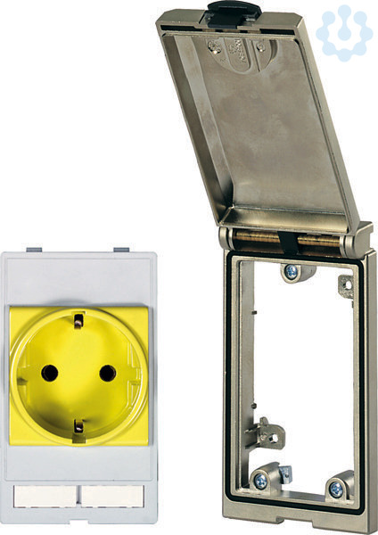 Frontplattenschnittstellen-Set. Rahmen 1-fach matt-vernickelt IP65 / VDE Steckdose gelb