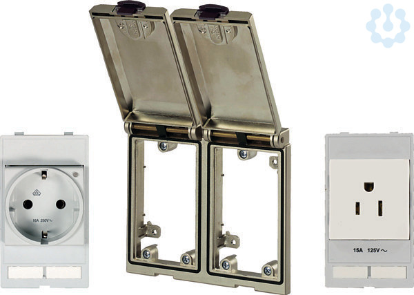 Frontplattenschnittstellen-Set. Rahmen 2-fach matt-vernickelt IP65 / VDE Steckdose