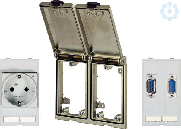Frontplattenschnittstellen-Set. Rahmen 2-fach matt-vernickelt IP65 / VDE Steckdose