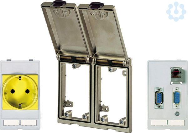 Frontplattenschnittstellen-Set. Rahmen 2-fach matt-vernickelt IP65 / VDE Steckdose gelb