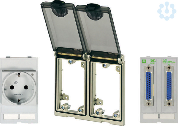 Frontplattenschnittstellen-Set. Rahmen 2-fach matt-vernickelt IP65 / VDE Steckdose