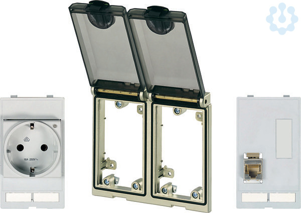 Frontplattenschnittstellen-Set. Rahmen 2-fach matt-vernickelt IP65 / VDE Steckdose