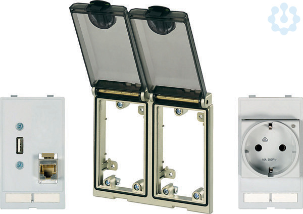 Frontplattenschnittstellen-Set. Rahmen 2-fach matt-vernickelt IP65 / RJ45/45+USB-geschirmt