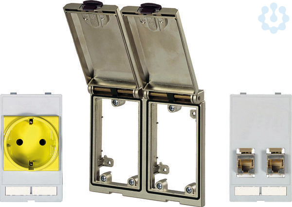Frontplattenschnittstellen-Set. Rahmen 2-fach matt-vernickelt IP65 / VDE Steckdose gelb