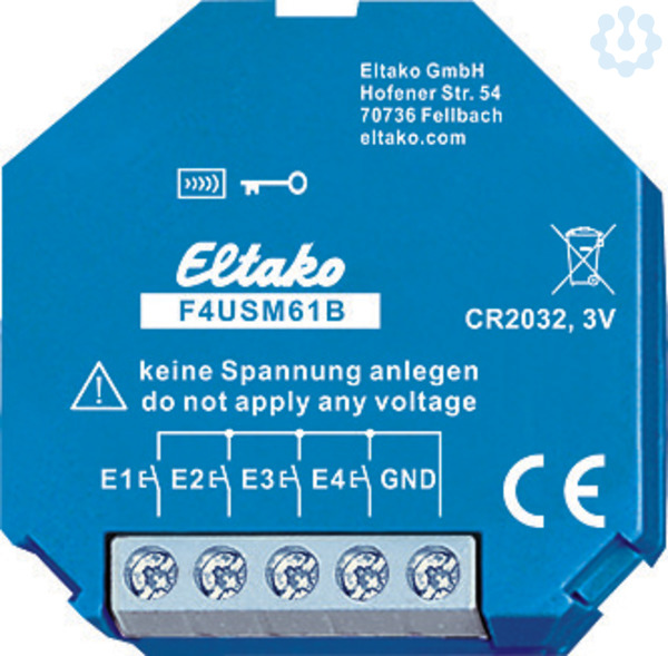 Funk-4-fach-Universal-Sendemodul. Mit innenliegender Antenne. Mit Batterie (Lebensdauer 5-8 Jahre). Für Einbaumontage. 45mm lang, 45mm breit, 18mm tief. Dieses Funk-Sendemodul hat vier Kanäle und kann damit wie ein 4-Kanal-Funktaster Funktelegramme in den Eltako-Gebäudefunk senden. E1 veranlasst ein Funktelegramm wie Wippe oben drücken eines Funktasters mit einer Wippe, E2 wie Wippe unten drücken (bzw. jeweils rechte Wippe eines Funktasters mit Doppelwippe), E3 wie linke Wippe oben drücken eines Funktasters mit einer Doppelwippe und E4 wie linke Wippe unten drücken eines Funktasters mit einer Doppelwippe. Das Telegramm beim Öffnen der Steuerkontakte ist identisch wie Funktaster loslassen. Die Steuereingänge können mit innenliegenden Jumpern entweder für Taster (Auslieferzustand), Fenster-Türkontakte oder Bewegungsmelder aktiviert werden. Mit einer Leitungslänge von bis zu 10 Metern können auch konventionelle Taster, Fenster-Türkontakte oder potenzialfreie Bewegungsmelder-Kontakte an die Klemmen E1, E2, E3 un