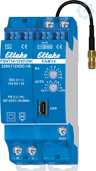 Funk-Antennenmodul für den Eltako-RS485-Bus mit austauschbarer Antenne. Mit integriertem Schaltnetzteil 12V DC/8W. Bidirektional. Verschlüsselter Funk. Stand-by-Verlust nur 1 Watt. Bei Bedarf kann eine Funkantenne FA250 oder FA200 angeschlossen werden. Reiheneinbaugerät für Montage auf Tragschiene. 36mm breit, 58mm tief. Versorgungsspannung 230V. Im Lieferumfang enthalten sind 1 Distanzstück DS14, 2 Abschlusswiderstände zum Aufstecken mit Aufdruck Ohm, 1/2 TE, 3 Steckbrücken 1 TE (davon 1 Ersatz), 1 Steckbrücke 1,5 TE, 2 Steckbrücken 1/2 TE (davon 1 Ersatz) und ein Steckbrücken-Montagewerkzeug SMW14. Das Funk-Antennenmodul FAM14 empfängt und prüft alle Signale der Funksender und Repeater in seinem Empfangsbereich. Diese werden über eine RS485-Schnittstelle an nachgeschaltete RS485-Bus-Schaltaktoren weitergegeben: Bis zu 126 Kanäle können an den RS485-Bus angeschlossen werden. Querverdrahtung Bus und Stromversorgung mit Steckbrücke. Am letzten Aktor muss der beiliegende zweite Abschlusswiderstand aufgesteckt w
