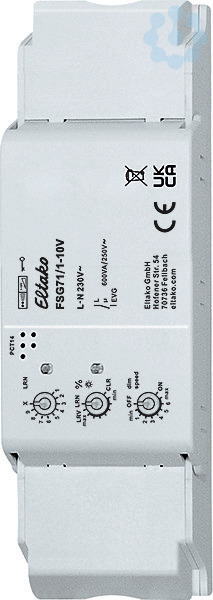 Dimmschalter-Steuergerät für EVG 1-10V, 1 Schließer nicht potenzialfrei 600VA und 1-10V-Steuerausgang 40mA. Mindesthelligkeit und Dimmgeschwindigkeit einstellbar. Mit Kinderzimmer-, Schlummer- und Lichtweckerschaltung sowie Konstantlichtregelung und Master-Slave-Betrieb. Zusätzlich mit Lichtszenensteuerung über PC oder mit Funktastern. Verschlüsselter Funk, bidirektionaler Funk und Repeater-Funktion zuschaltbar. Stand-by-Verlust nur 1,4 Watt. Montage in die 230V-Netzanschlussleitung, zum Beispiel in Zwischendecken und Leuchten. 166mm lang, 46mm breit und 31mm tief. Mit Kabel-Zugentlastung. Schaltung im Nulldurchgang zur Kontaktschonung. Auch zur Ansteuerung von LED-Konvertern mit passiver 1-10V Schnittstelle ohne Hilfsspannung bis zu 0,6mA. Darüber mit Hilfsspannung. Die eingestellte Helligkeitsstufe bleibt beim Ausschalten gespeichert (Memory). Bei einem Stromausfall werden die Schaltstellung und die Helligkeitsstufe gespeichert und wird gegebenenfalls bei Wiederkehr der Versorgungsspannung eingeschaltet. Mi